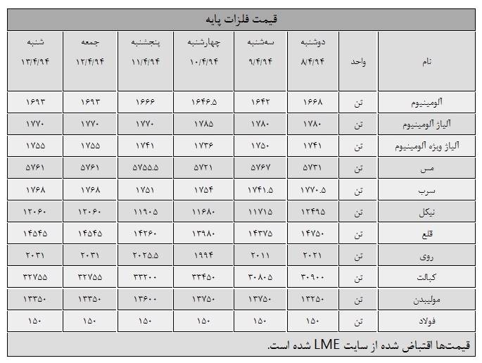 در ادامه همین گزارش بررسیها در میان فلزات پایه نشان میدهد که، به جز فلزات آلیاژ آلومینیوم، سرب و قلع بقیه فلزات قیمتشان روند رو به صعود داشته و فولاد همچون ماههای گذشته قیمت ثابت خود را حفظ کرده است.