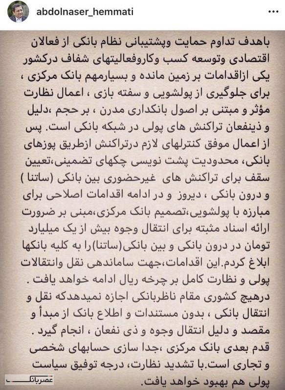 عبدالناصر همتی در تازه ترین یادداشت اینستاگرامی خود به سیاست های این بانک در محدود سازی تراکنش‌های بانکی و بخشنامه دیروز این بانک برای انتقال وجه بالای یک میلیارد تومان اشاره و اعلام کرد: برنامه بعدی این بانک جدا سازی حساب های بانکی شخصی و تجاری است.