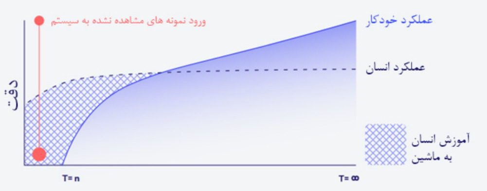 همانطور که در شکل پیدا است، عملکرد هوش مصنوعی و اپراتور انسانی در طول زمان مورد ارزیابی قرار گرفته است. قسمت هاشور خورده جزو مواردی است که جعل­های جدید اتفاق می­افتد و اپراتور انسانی با شناسایی و جمع­آوری داده­های اولیه جعل و کلاهبرداری­های جدید را برای ماشین تعریف می­کند.