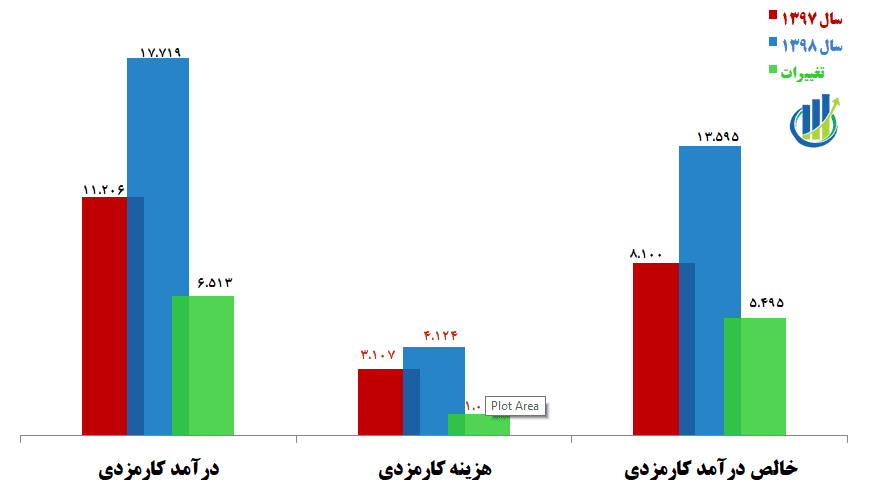 بر اساس نمودار زیر خالص درآمد کارمزدی در سال 98 نسبت به سال قبل بیش از 5 هزار میلیارد ریال افزایش داشته، هزینه کارمزدی بیش از 1 هزار میلیارد ریال و درآمد کارمزدی بیش از 6 هزار میلیارد ریال افزایش داشته است.