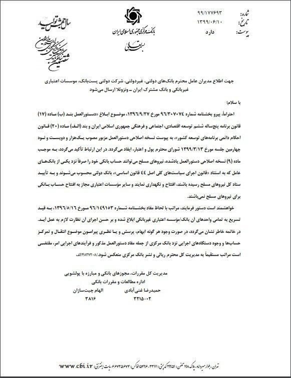 بانک مرکزی در بخشنامه‌ای به تمامی بانک‌ها و موسسات اعتباری اعلام کرد: به موجب ماده 9 نسخه اصلاحی دستورالعمل «بند ب ماده 17 قانون برنامه پنجساله ششم توسعه اقتصادی اجتماعی و فرهنگی جمهوری اسلامی ایران» و «بند الف ماده 23 قانون احکام دائمی برنامه‌های توسعه کشور» نیرو‌های مسلح می‌توانند حساب بانکی خود را صرفاً نزد یکی از بانک‌های عاملی که به استناد «قانون اجرای سیاست‌های کلی اصل 44 قانون اساسی» بانک دولتی محسوب می‌شوند و به تایید ستادکل نیرو‌های مسلح رسیده باشند، افتتاح و نگهداری کنند و سایر موسسات اعتباری مجاز به افتتاح حساب بانکی برای نیرو‌های مسلح نیستند.