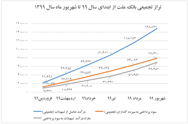 بر این اساس، وبملت در شهریور ماه سال جاری 33,074 میلیارد ریال درآمد حاصل از تسهیلات اعطایی شناسایی نموده و 15,274 میلیارد ریال سود سپردهگذاری پرداخت کردهکه با این حساب در ششمین ماه سال 1399، تراز عملیاتی بانک 17,800 میلیارد ریال مثبت است. به این ترتیب تراز بانک 79 درصد بیشتر از ماه قبل و 89 درصد بیشتر از مدت مشابه در سال قبل است.