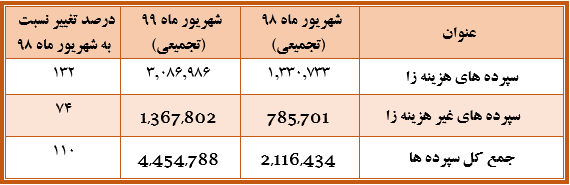 در مجموع کل مانده سپردهها در مقایسه با مدت مشابه در سال گذشته با جهش قابل ملاحظه 110 درصدی از مبلغ 2,116,434 میلیارد ریال به 4,454,788 میلیارد ریال افزایش یافته است.