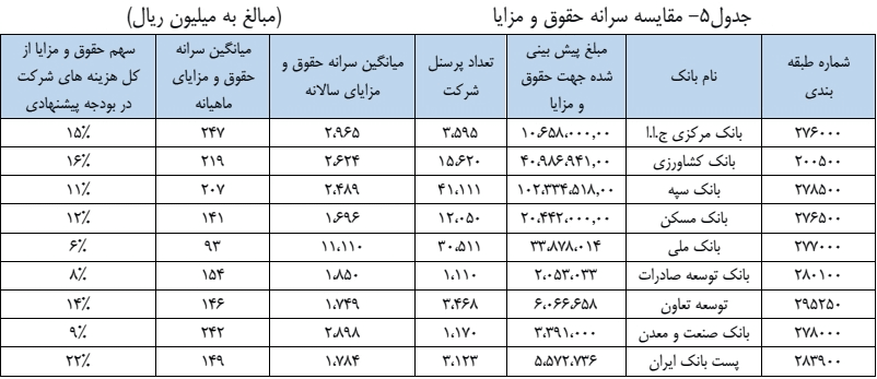 براساس این گزارش که جزئیات آن در جدول فوق آمده است، بانک مرکزی 3595 پرسنل داشته که میانگین سرانه حقوق و مزایای ماهیانه آنها 24 میلیون و 700 هزار تومان پیش بینی شد. پس از آن بانک کشاورزی با 15 هزار و 620 پرسنل بالغ بر 21 میلیون و 900 هزار تومان حقوق و مزایای ماهانه می‌دهد. سومین جایگاه متعلق به بانک سپه است که در حال حاضر به دلیل ادغام چند بانک نظامی بالغ بر 41 هزار و 311 نفر نیرو داشته و میانگین ماهانه سرانه حقوق و مزایای آن 20 میلیون و 700 هزار تومان ثبت شده است.کمترین حقوق در میان بانکهای دولتی متعلق به بانک ملی با 9 میلیون و 300 هزار تومان به ثبت رسید.