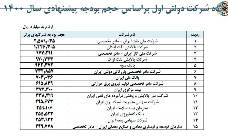 سازمان برنامه و بودجه گزارش داد: بانک سپه بر اساس حجم بودجه پیشنهادی سال 1400 به عنوان پنجمین شرکت دولتی محسوب می شود که حجم بودجه آن بالغ بر 93 هزار و 430 میلیارد تومان است‌. بانک ملی نیز در جایگاه هفتم قرار گرفته که حجم بودجه آن 70 هزار  و 303 میلیارد تومان پیش بینی می‌شود. بانک کشاورزی هم جایگاه سیزدهم این جدول با 25 هزار و 552 میلیارد تومان به خود اختصاص داد.