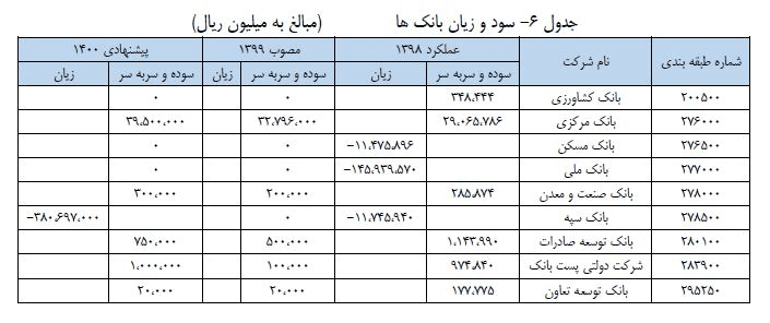 براساس بررسی های دیوان محاسبات، علیرغم سودده بودن تعداد 5 بانک دولتی و سربه‌سر بودن تعداد 3 بانک و زیان ده بودن 1 بانک در بودجه پیشنهادی سال 1400 ، عملکرد سال 1398 و شش ماهه اول سال 1399 بانکها طبق گزارش ارائه شده حاکی از زیانده بودن به ترتیب تعداد 3 و 6 بانک در سالهای مذکور در این بخش می‌باشد.