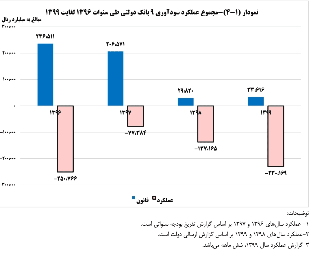 همچنین در «خلاصه مدیریتی» این گزارش دیوان محاسبات با اشاره به زیان ده بودن مجموع عملکرد بانکهای دولتی در سال های 96 تا 98 آمده است: بررسی عملکرد بانکهای دولتی در سال 99 نشان می‌دهد علیرغم پیش بینی سود، مجموع عملکرد نه بانک دولتی در شش ماهه نخست سال به میزان منفی 230 هزار و 369 میلیارد ریال و با حذف عملکرد بانک مرکزی به میزان منفی 223 هزار و و 907 میلیارد ریال زیان ده شده اند.