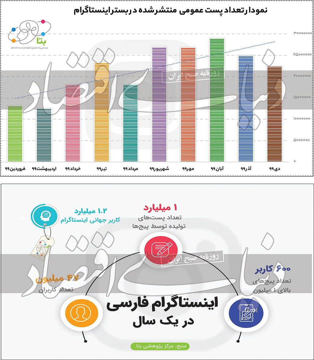 براساس نمودار، تعداد پستهای عمومی منتشر شده از ابتدای سال 99 به تفکیک ماه، آبان امسال با تولید نزدیک به 30 میلیون پست، رکورددار بیشترین تعداد پست درج شده در این شبکه است و اردیبهشت ماه با نزدیک به 13 میلیون پست، کمترین تعداد پست منتشر شده در طول یک ماه را تا این مقطع از سال 99 به خود اختصاص داده است. این ارقام براساس انتشار پستهای عمومی که توسط صفحات جدی اینستاگرام منتشر میشوند و دنبالکننده زیاد یا متوسط دارند محاسبه شده است و پستهای درج شده در صفحات خصوصی و صفحاتی را که تعداد کمی دنبالکننده دارند شامل نمیشود. مدیر مرکز پژوهشی بتا در پاسخ به حواشی مطرح شده اخیر پیرامون فیلتر شدن اینستاگرام میگوید: نگاه حذفی به شبکههای اجتماعی کارساز نیست. وی با اشاره به میلیونی بودن تعداد کاربران چنین شبکههای اجتماعی اعم از اینستاگرام میافزاید: در این مسیر باید نقشه راهی وجود داشته باشد و باید آینده شبکه اجتماعی را بدانیم و طبق آن برنامهریزی کنیم. اگر اینستاگرام فیلتر شد جایگزین آن چه خواهد بود و برنامه بعدی چیست، اینکه فقط به فکر فیلتر کردن بدون هیچ جایگزینی باشیم، برنامه مناسبی نیست.