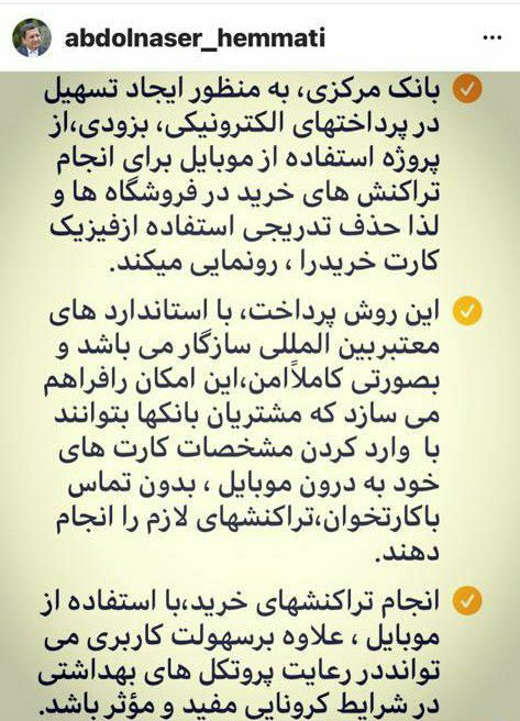 عبدالناصر همتی، رئیس کل بانک مرکزی در یادداشتی در صفحه شخصی خود در اینستاگرام نوشت: بانک مرکزی، به منظور ایجاد تسهیل در پرداخت‌های الکترونیکی، بزودی، از پروژه استفاده از موبایل برای انجام تراکنش‌های خرید در فروشگاه‌ها و لذا حذف تدریجی استفاده از فیزیک کارت خرید را، رونمایی می‌کند.