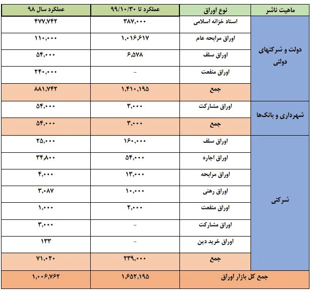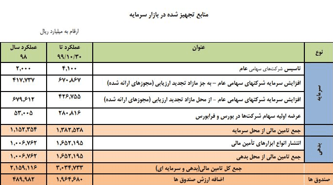 در بازار اوراق بدهی امسال با انتشار انواع ابزارهای تأمین مالی 165 هزار میلیارد تومان تأمین مالی شده است، همچنین از محل صندوقها 196 هزار میلیارد تومان تأمین مالی صورت گرفته است، به هر حال با ابزارهای بازار سرمایه، انتشار اوراق بدهی و انتشار اوراق امسال در مجموع حدود 500 هزار میلیارد تومان تأمین مالی از بازار سرمایه صورت گرفته است که عمده آن توسط شرکتهای بورسی و فرابورسی بوده است و بخشی از تامین مالی نیز جذب دولت و شرکتهای دولتی شده است.