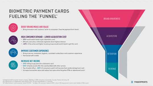 احراز هویت بیومتریک در روش‌های پرداخت در حال رشد می‌باشد. این فناوری با شبکه‌های اصلی پرداخت، منطبق شده و به تازگی از سمت EMVCo نیز به رسمیت شناخته شده است. مشتریان به فناوری‌های باز کردن قفل اپلیکیشن‌های بانکداری و پرداخت‌ توسط اسکن اثرانگشت عادت کرده‌اند اما پرداخت‌های موبایلی، در هر موقعیت یا برای هر قشری از جامعه موثر واقع نخواهد شد. تنها 2% از مشتریان برای خریدهای فروشگاهی روزمره خود از موبایل خود استفاده می‌کنند و در واقع 74% از کاربران فعال در پرداخت موبایلی نیز علاقه‌مند به داشتن کارت پرداخت بیومتریک می‌باشند. کارت و موبایل، در پرداخت‌های آنلاین و فیزیکی و در موقعیت‌ها و شرایط مختلف، همسان با یکدیگر عمل می‌کنند.