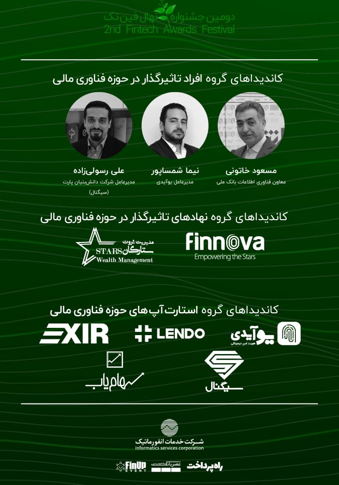 داوران دومین جشنواره نهال فینتک ایران با درنظرگرفتن معیار اثرگذاری در سال 1399 مسعودخاتونی «معاون فناوری اطلاعات بانک ملی» على رسولی زاده «مدیرعامل سیگنال» و نیما شمساپور «مدیرعامل یوآیدی» را بهعنوان افراد تأثیرگذار در حوزه فناوریهای مالی و بانکی در سال 99 انتخاب کردند.