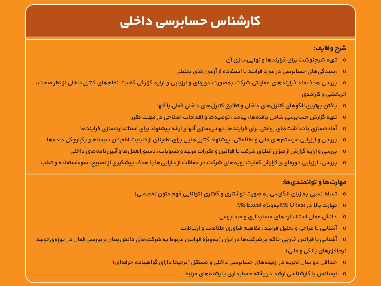 شرح کامل وظایف و مهارتهای کارشناس حسابرسی داخلی را میتوانید در جدولهای پایین مشاهده کنید. در صورتی که مهارتها و تواناییهای نوشته شده را دارید و از عهده انجام وظایف آن برمیآیید، رزومهتان را از طریق «بخش دعوت به همکاری» سایت داتین ارسال کنید.