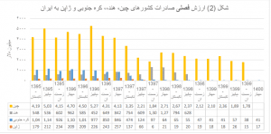 منبع آمار رسمی گمرک این کشورها هستند و طبیعی است که برای کشوری مانند چین، آمار رسمی واردات نفت خام کمتر از واقعیت باشد. همانطور که در ( شکل ۲) ملاحظه میشود، پس از اعمال به میزان معافیت تحریمها در پاییز ۱۳۹۷ به جز چین، واردات از ۳ به صفر می رسد. البته هند به طور موقت در فصول مرتبط، اقدام به صادرات به ایران کرده است. اما حجم صادرات ژاپن و کره جنوبی به ایران بعد از پاییز ۱۳۹۷ بسیار ناچیز است.