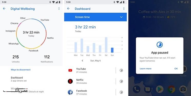 این ابزار برنامه ای به نام Digital Wellbeing است که برای گوشی های پیکسل و گوشی های اندرویدی پیشرفته عرضه شده و به کاربران امکان می دهد دریابند چه مدت زمانی را صرف استفاده از هر برنامه و اپلیکیشن کرده اند و چند بار قفل گوشی خود را باز کرده اند تا از برنامه ای استفاده کنند.