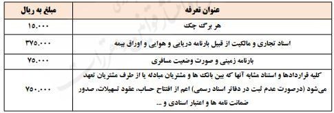 مطابق جدول پیوست این بخشنامه، حق تمبر هر برگ چک ۱۵ هزار ریال تعیین شده و برای اسناد تجاری و مالکیتی از جمله بارنامههای دریایی و هوایی و اوراق بیمه، ۳۷۵ هزار ریال حق تمبر در نظر گرفته شده است.