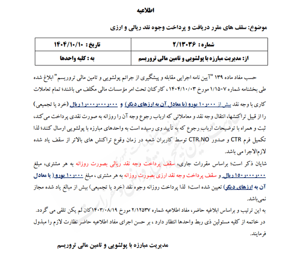 طبق اطلاعیه جدید مدیریت مبارزه با پولشویی و تأمین مالی تروریسم بانکها، کلیه کارکنان موسسات مالی موظف هستند تمام تراکنشهای نقدی بیش از ۱۰,۰۰۰ یورو (یا معادل آن به ارزهای دیگر) و ۱۰۰ میلیون تومان را پیش از انجام، ثبت کرده و همراه با توضیحات مشتری به واحد مبارزه با پولشویی ارسال کنند.