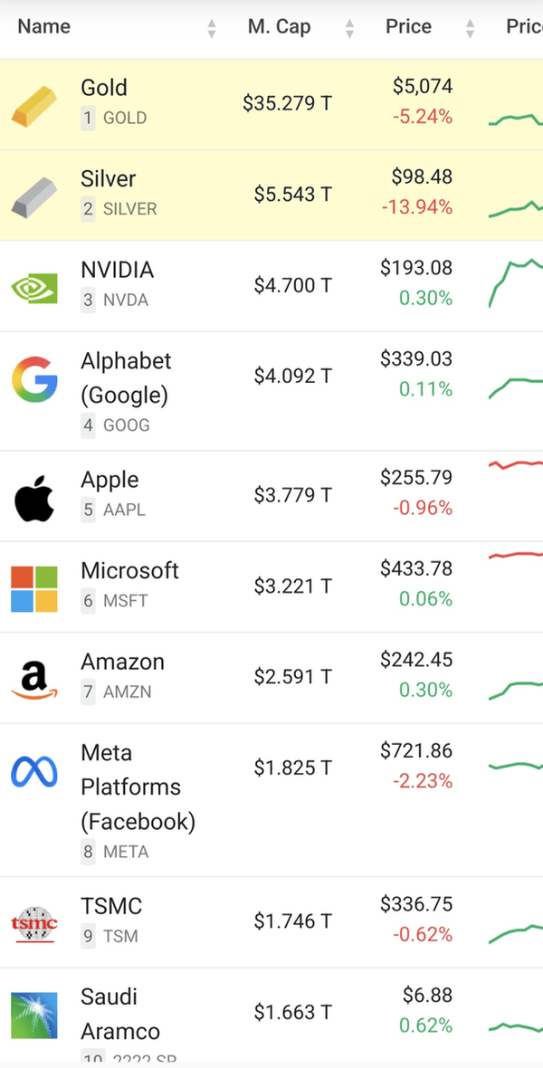 در حال حاضر سه دارایی بزرگ جهان از نظر ارزش بازار عبارتاند از طلا با ارزش بازار حدود ۳۸.۶۳ تریلیون دلار، نقره با ارزش بازار حدود ۶.۶۱ تریلیون دلار انویدیا با ارزش بازار حدود ۴.۶۶ تریلیون دلار هستند.