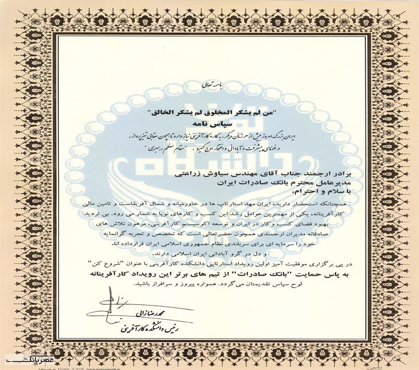 لوح سپاس دانشکده کارآفرینی دانشگاه تهران به مدیرعامل بانک صادرات ایران اعطا شد