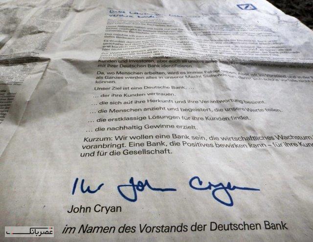 عصر بانک؛به گزارش ایسنا، این پیام که از سوی جان کریان، مدیرعامل دویچه بانک به نمایندگی از سوی هیات مدیره امضا شد، در روزنامههای فرانکفورتر آلگماینه سایتونگ و زوددویچه سایتونگ به چاپ رسید.